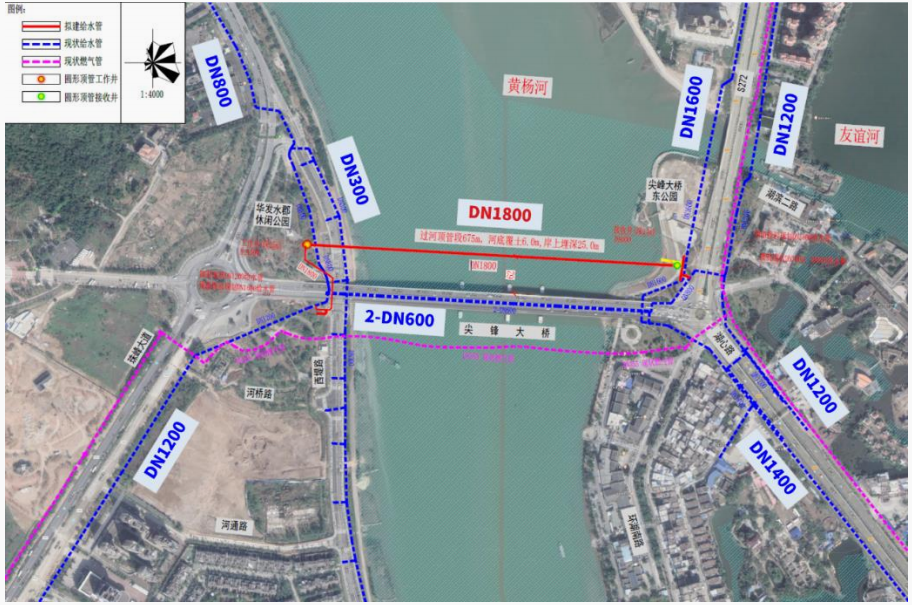 本项目建设内容包括尖峰大桥处新建1根DN1800给水主干管约925m;东岸与省道S272现DN1600供水主干管接驳,联通现状DN800给水管,并预留后期规划DN1800给水管接驳口;西岸与西堤路现状DN1200供水主干管接驳、预留DN1600远期规划供水管接驳口。