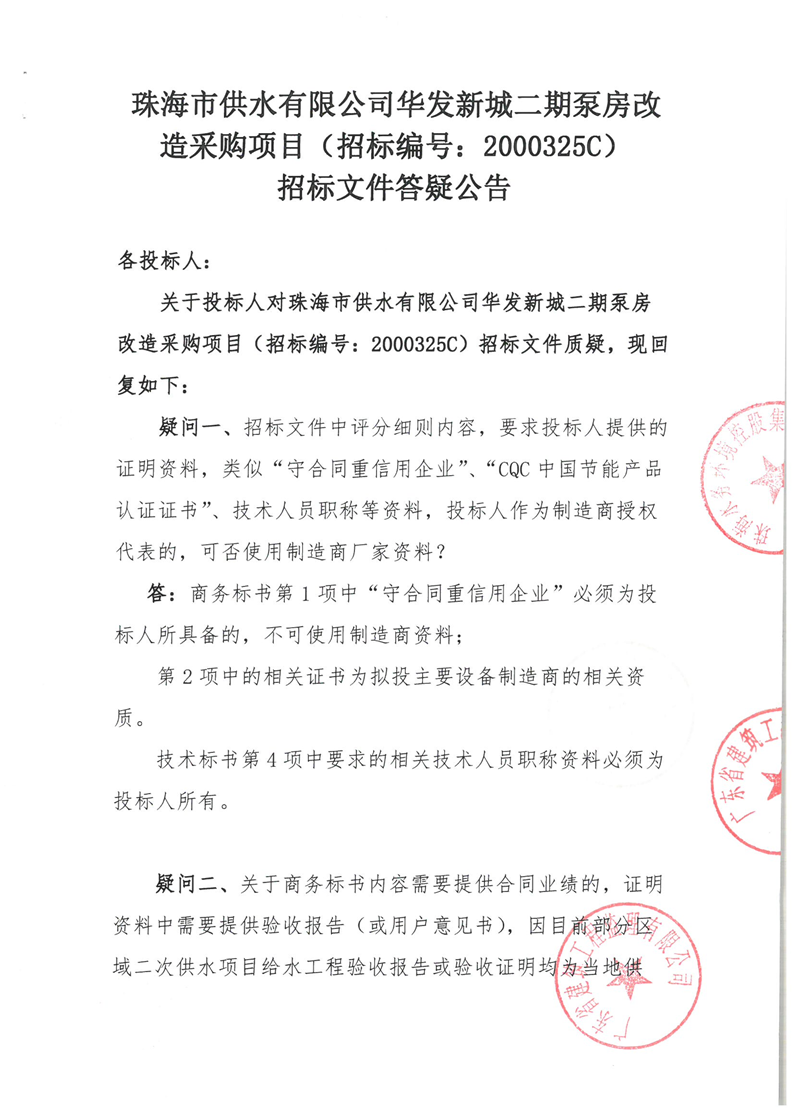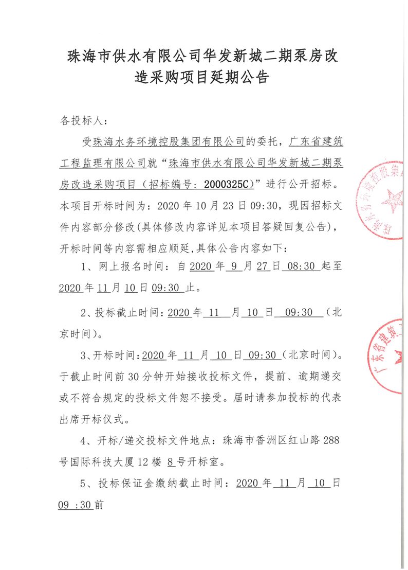 珠海市供水有限公司华发新城二期泵房改造采购项目延期公告