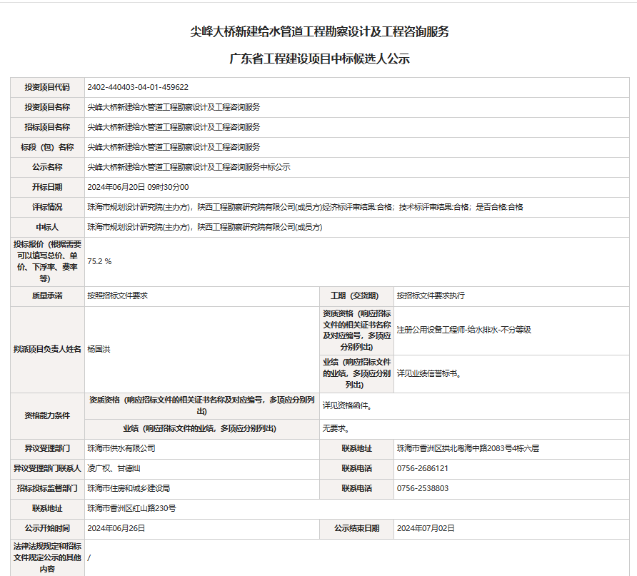 尖峰大桥新建给水管道工程勘察设计及工程咨询服务中标公示
