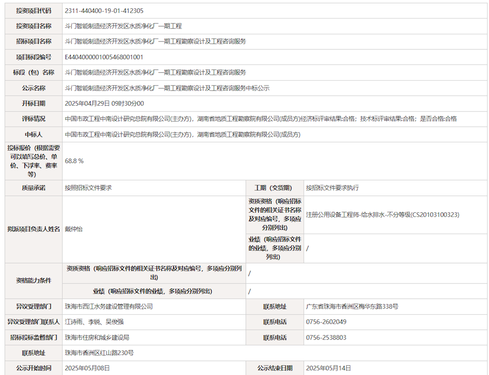 斗门智能制造经济开发区水质净化厂一期工程勘察设计及工程咨询服务中标公示