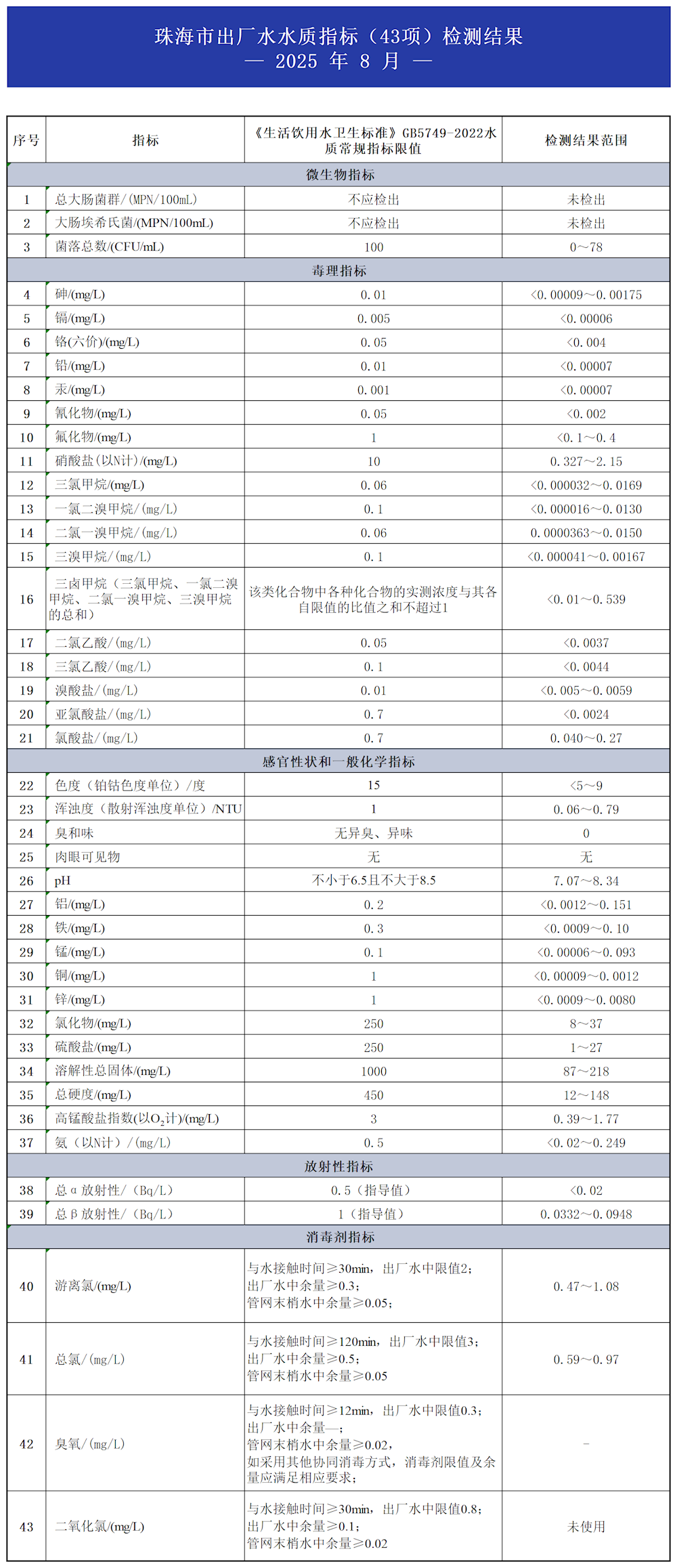 2025年8月珠海市出厂水水质指标(43项)检测结果